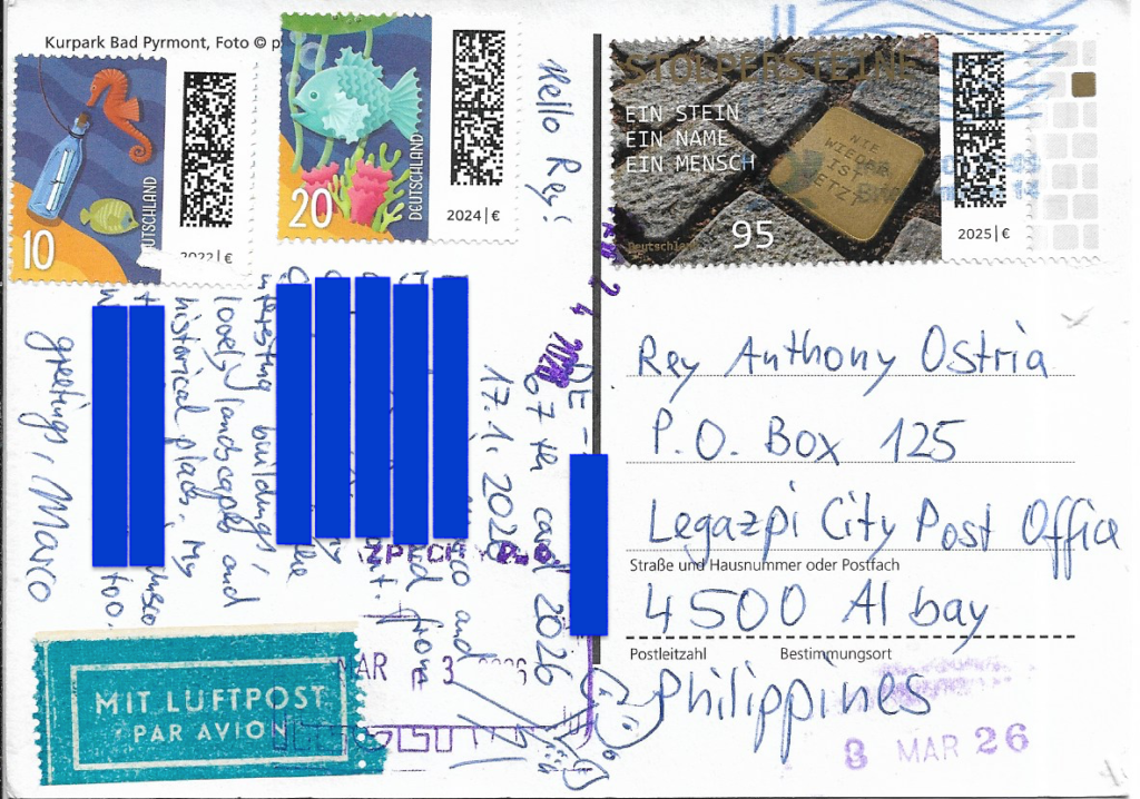 | STAMP: Stolpersteine, Fish, Message in a bottle with fish and seahorse | DATES: January 17, 2026 (Written) February 24, 2026 (Received) March 3, 2026 (Received) |