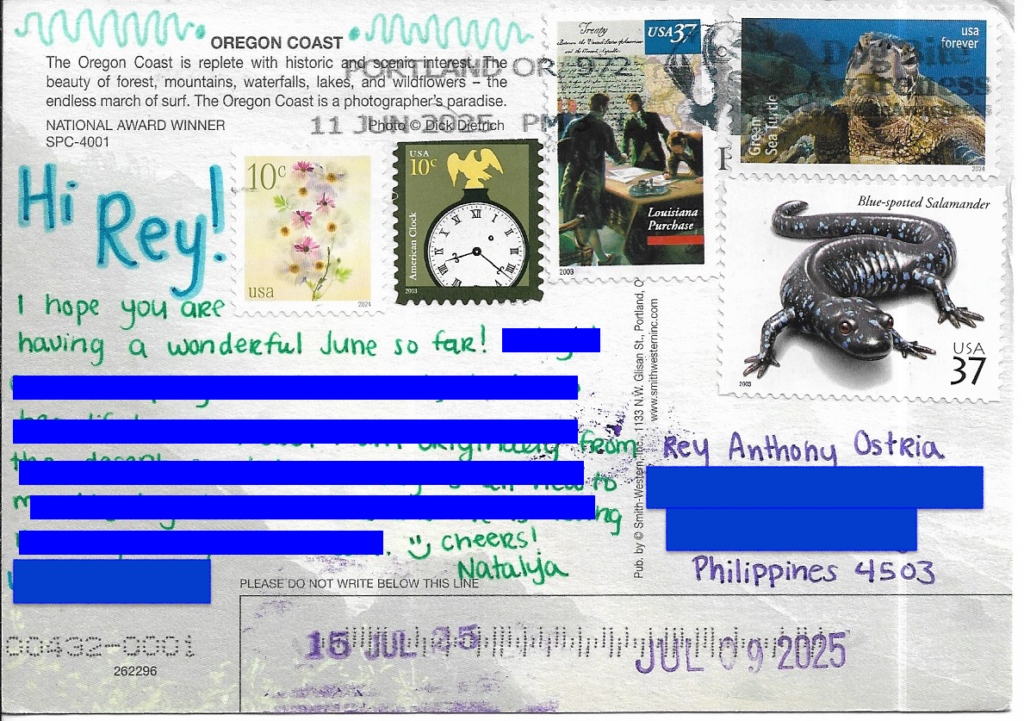 | STAMPS: USA Forever Stamp, American Clock, Louisiana Purchase, Green Sea Turtle, Blue-spotted Salamander | DATES: June 11, 2025 (Written) July 9, 2025 (Received) July 15, 2025 (Received) |