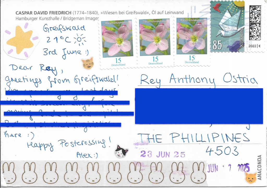 | STAMPS: Paper doves, Wiesenchaumkraut | DATES: June 3, 2025 (Written) June 7, 2025 (Received) June 23, 2025 (Received) |