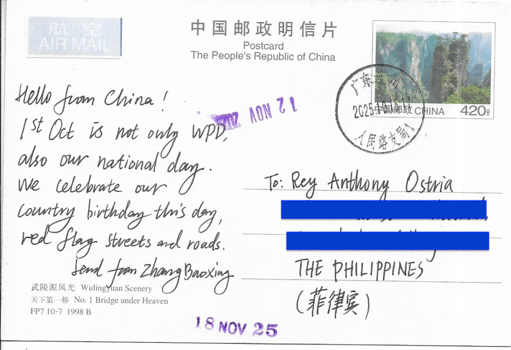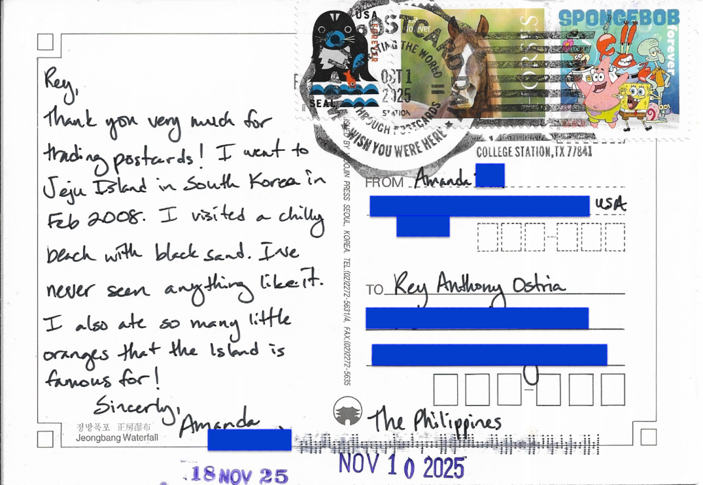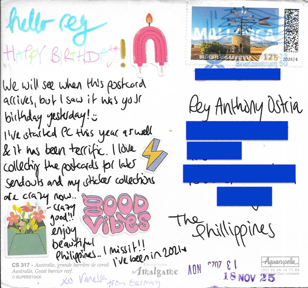 | MESSAGE: Happy Birthday! We will see when this postcard arrives, but I saw it was your birthday yesterday! 😉 I’ve started PC this year as well & it has been terrific. I love collecting the postcards for later sendouts and my sticker collections are crazy now… Crazy good!! Enjoy beatiful Philippines.. I miss it!! I’ve been in 2021. | NOTE: Direct swap from online community (Reddit or Facebook). |