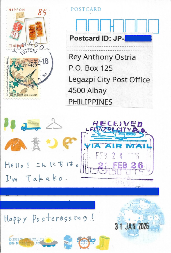 | STAMP: Mitarashi Dango, International Letter Writing Week – Java Sparrow and Magnolia | DATES: January 31, 2025 (Sent) February 23, 2026 (Received) February 24, 2026 (Received) |
