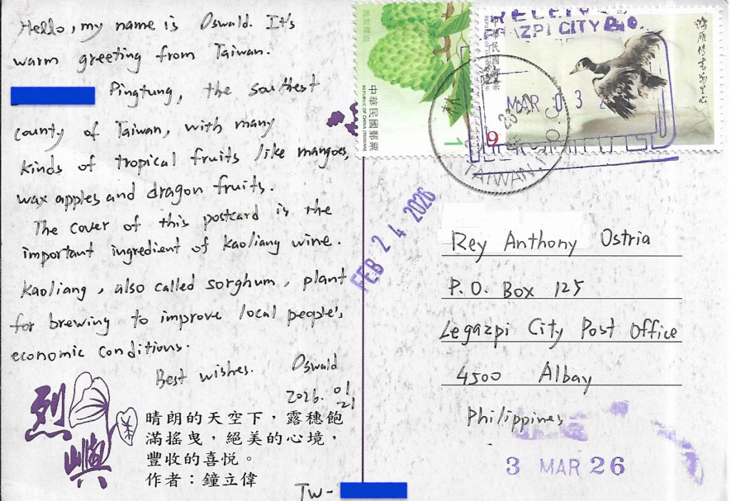 | STAMP: Atemoya / Atis, Swan Goose | DATES: January 21, 2026 (Written) January 23, 2026 (Sent) February 24, 2026 (Received) March 3, 2026 (Received) |