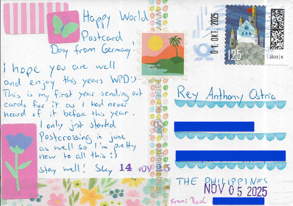 | MESSAGE: Happy World Postcard Day from Germany! I hope you are well and enjoy this WPD 🙂 This is my first year sending out cards for it as I had never heard of it before this year. I only just started postcrossing in June as well so I’m pretty new to all this 🙂 Stay well! | NOTE: Direct swap from online community (Reddit or Facebook). |