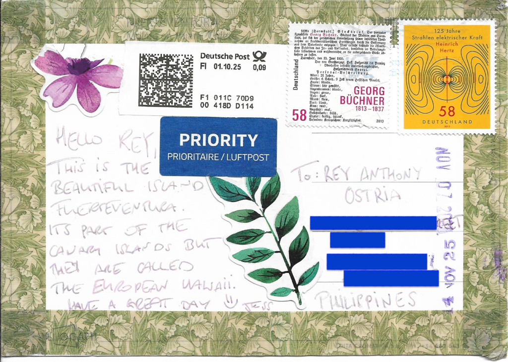 | STAMPS: George Buchner “Playwright” and Heinrich Hertz | DATES: October 1, 2025 (Sent) November 7, 2025 (Received) November 25, 2025 (Received) |