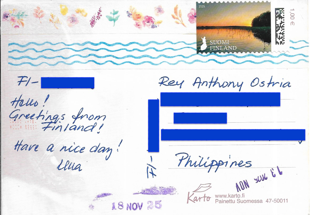 | MESSAGE: Hello! Greetings from Finland! Have a nice day! | NOTE: Postcrossing |