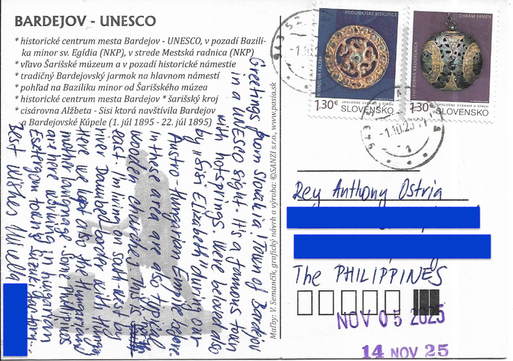 | MESSAGE: Greetings from Slovakia. Town of Bardejov in a UNESCO site! It’s a famous town with hotsprings. We’re beloved also by “Sisi Elizabeth” during our Austro-Hungarian Empire before. In these area are also typical wooden churches. This is north east. I’m living in southeast by river Danube—border with Hungary. Here we kept also the Hungarian mother language. Some Filipinos are here working Esztergom town’s Suzuki factory. | NOTE: Direct swap from online community (Reddit or Facebook). |