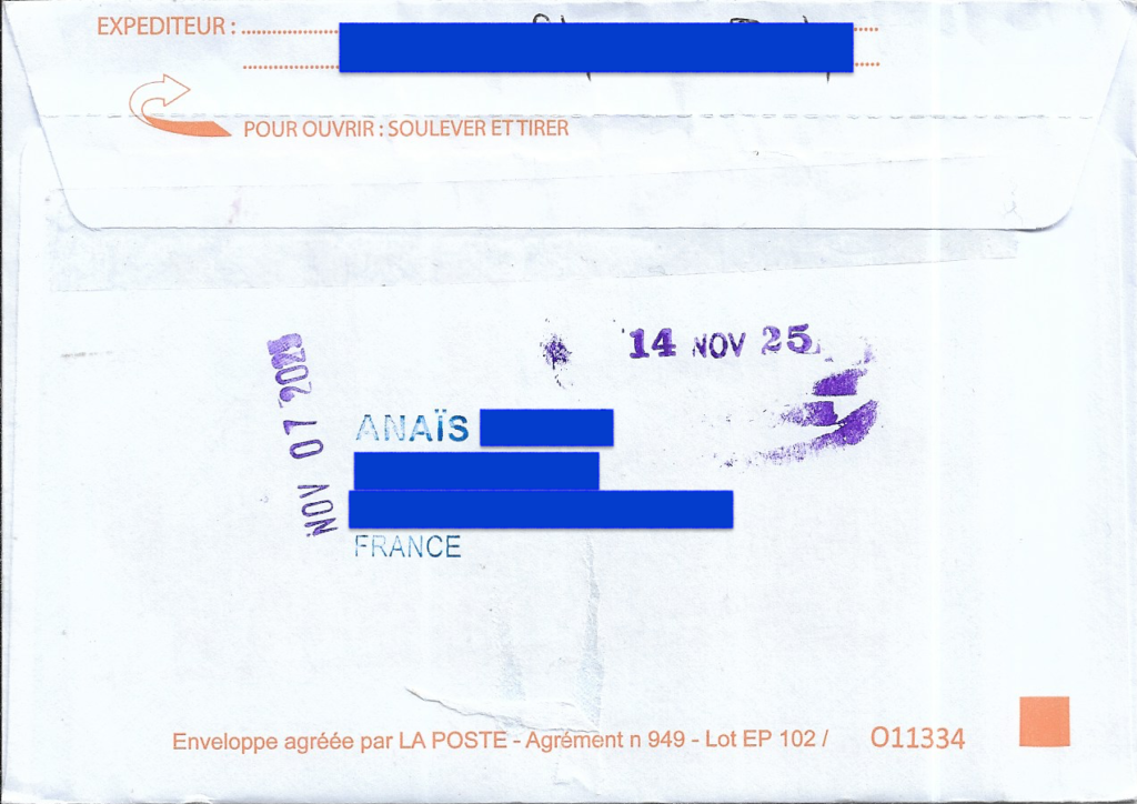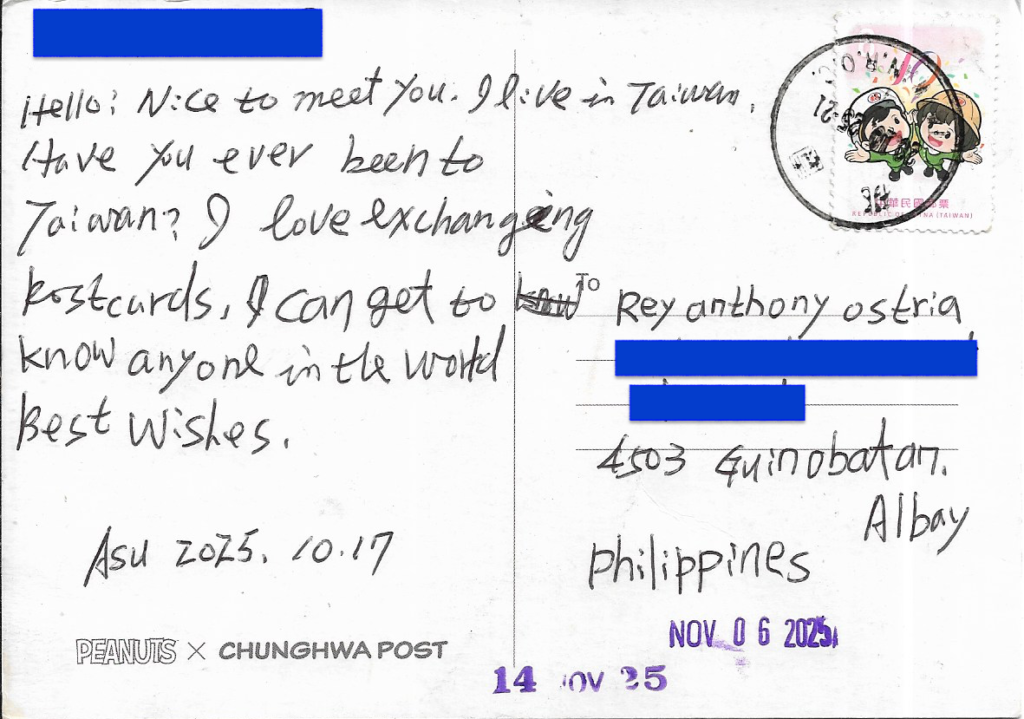 | STAMPS: Postal Characters | DATES: October 17, 2025 (Written) November 6, 2025 (Received) November 14, 2025 (Received) |