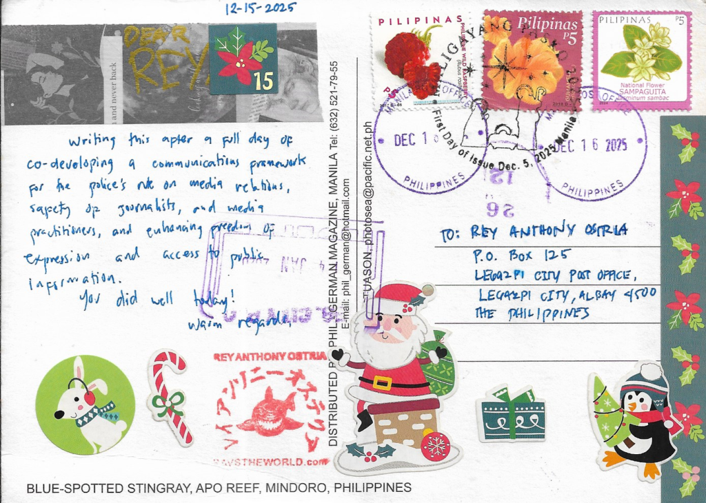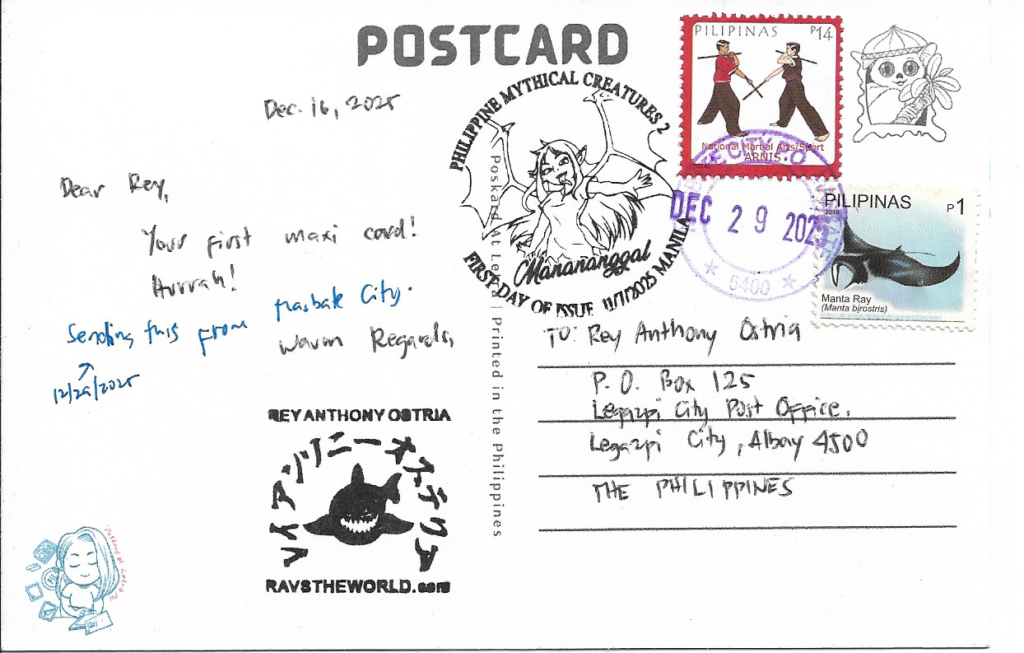 | STAMPS: Arnis, Manta Ray (Mobula birostris), Santelmo | DATES: December 16, 2025 (Made) December 29, 2025 (Sent) |