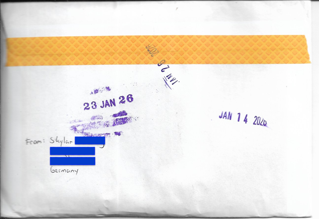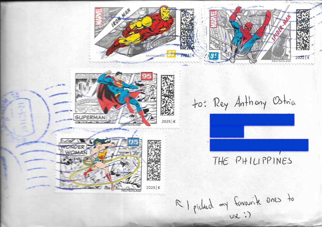 | STAMPS: Iron Man, Spider-Man, Superman, Wonder Woman | DATES: January 14, 2026 (Received) January 23, 2026 (Received) January 26, 2026 (Received) |