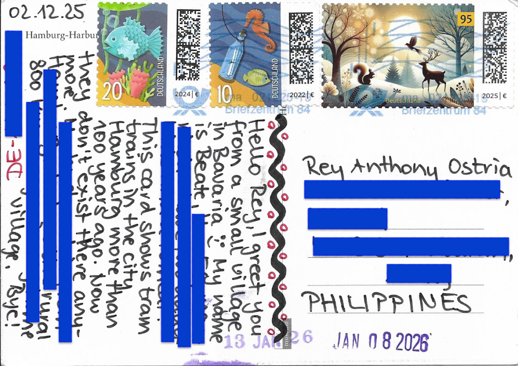 | STAMPS: Message in a bottle with seahorse, fish, Christmas 2024 | DATES: December 2, 2025 (Written) January 8, 2026 (Received) January 13, 2026 (Received) |